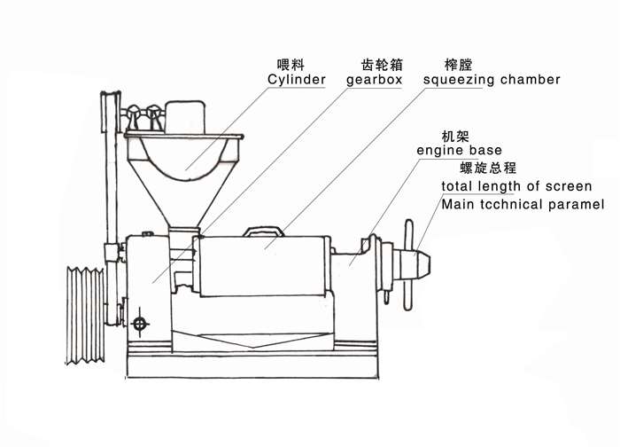 榨油機運轉時,將處理好的料胚帶如料斗,油料從料斗進入榨膛。有榨螺的螺旋向里推進,進行壓榨。